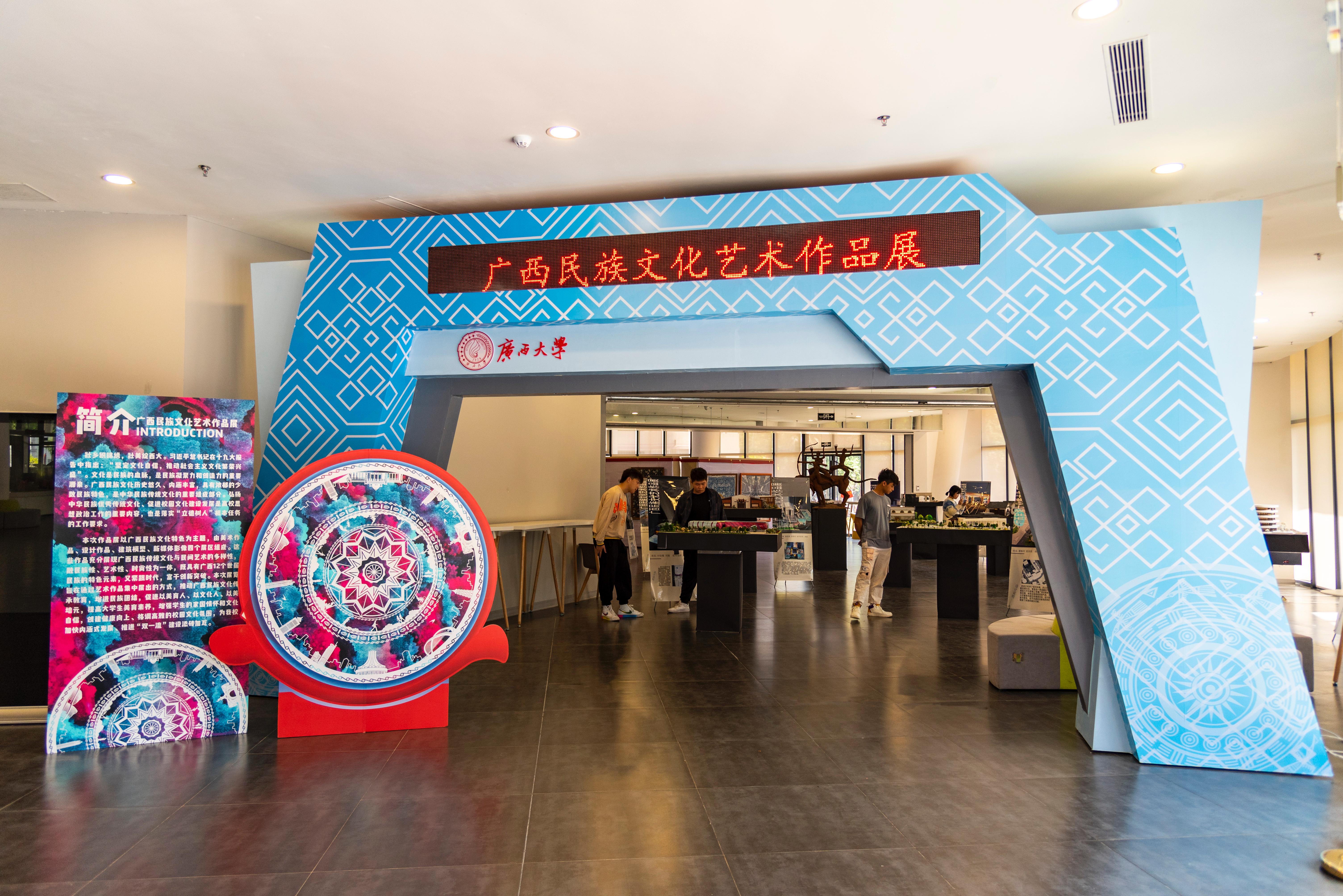 本次作品展设有美术作品、设计作品、建筑模型、新媒体影像四个展区,充分展现广西民族传统文化与民间艺术的多样性,融民族性、艺术性、时尚性为一体,既具有广西12个世居民族的特色元素,又紧跟时代,富于创新突破。本次展览将持续7天。