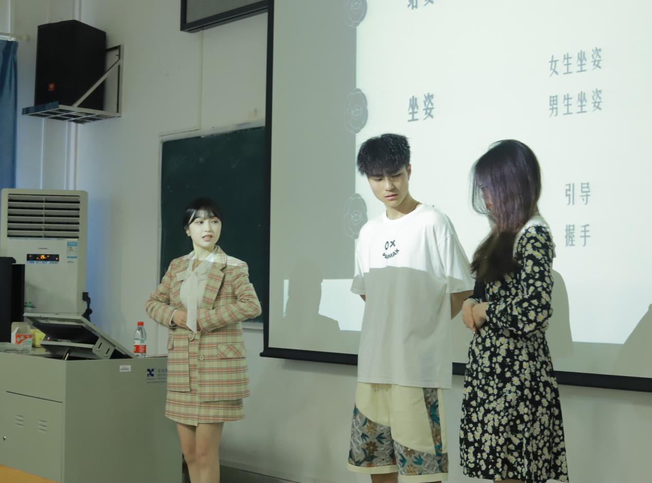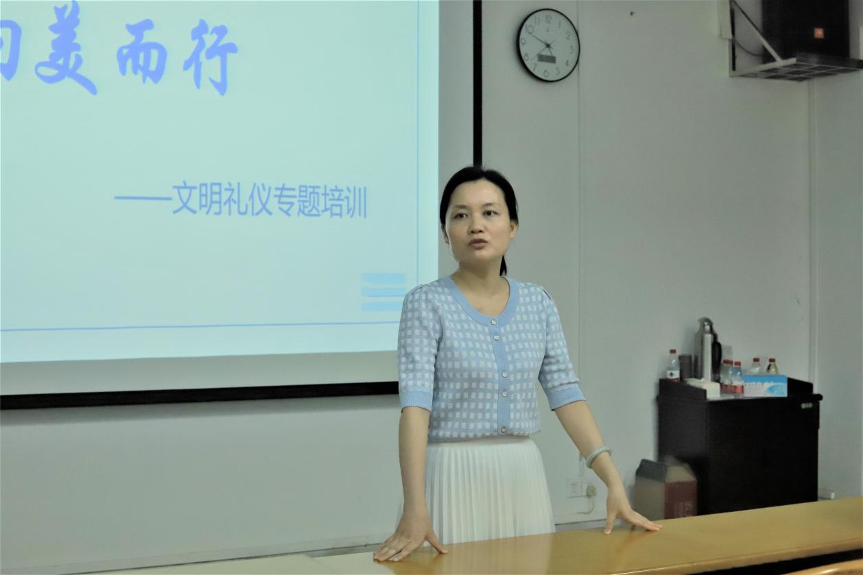 培训班邀请到广西保利剧院管理有限公司营销中心演出接待、公司员工胡馨文为员工干部进行文明礼仪专题培训,她从仪容礼仪、仪态礼仪、社交礼仪、校园礼仪等方面进行讲授,并邀请员工代表进行礼仪示范,最后她结合自身工作经历阐述文明礼仪的重要性。