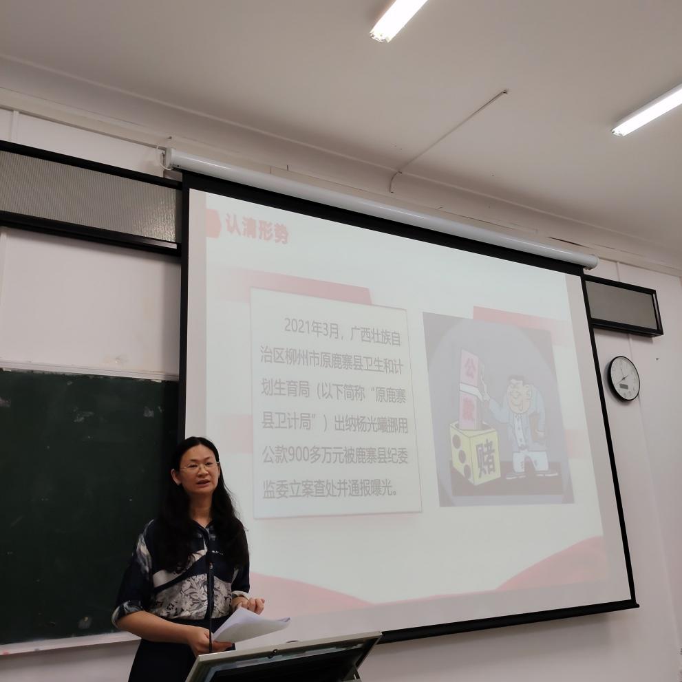 最后,她针对如何做清正廉洁干部给全院师生党员提出了几点要求:1.加强理论学习,防微杜渐把好思想防线;2. 在实践中磨炼,廉洁自律不触碰红线;3.修炼内在涵养,攻坚克难起带头作用;4.自觉接受监督,履职尽责做清正廉洁干部。