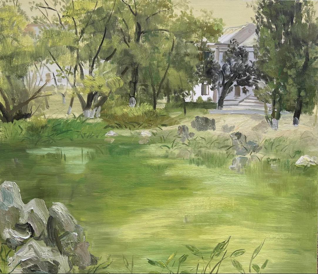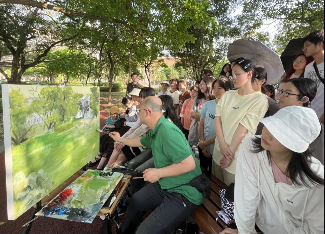 庞凌宇老师在《油画构成与表现---校园写生》课程中为同学们授课,并进行校园写生的现场示范。他分别从构图取舍、色调分析归纳、色彩的调和及技法表现等方面,为同学们分步骤示范,进行精细的指导。庞老师灵动沉稳的用笔,清雅温润的色彩,营造出诗意般的空灵清幽之境,感染着在场的每一位同学。