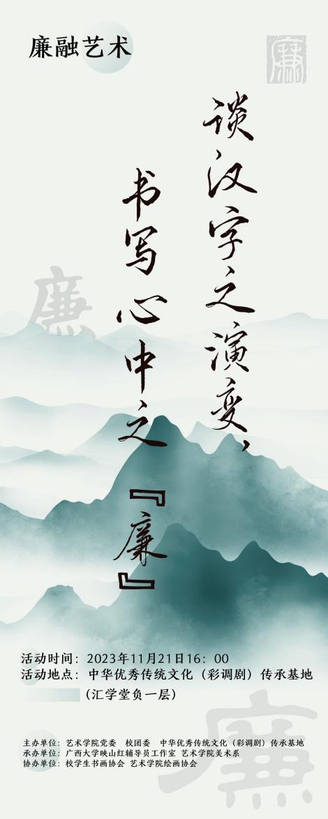 为贯彻落实学校“清廉西大”建设的任务要求,推进廉洁文化建设。11月21日下午,由公司党委、校团委、中华优秀传统文化(彩调剧)传承基地主办,太阳成集团tyc151cc映山红辅导员工作室、太阳成集团tyc151cc美术系承办,校员工书画协会、太阳成集团tyc151cc绘画协会协办的“廉融艺术”主题实践公司产品活动——“谈汉字之演变,书写心中之‘廉’”在中华优秀传统文化(彩调剧)传承基地举行。公司党委书记黄里云、副书记邓莹、副经理穆枭出席活动,太阳成集团tyc151cc教授张明学、美术系主任吕峰、校团委陈晓江老师、文学院教师韦明刚等教师代表以及校员工书画协会、太阳成集团tyc151cc绘画协会员工代表参加本次活动。